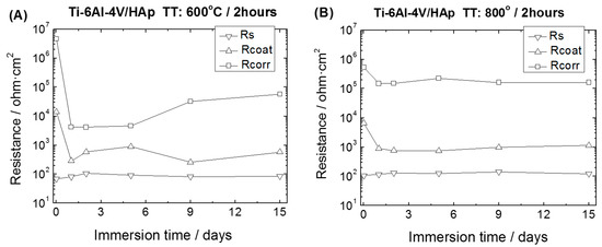 Evolution of the Rs, Rcoat and Rcorr values with immersion time in SBF of HAp-coatings/Ti6Al4V systems. Thermal Treatments: (A) 600 °C/2 h and (B) 800 °C/2 h.