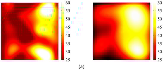 Comparisons of experimental and simulated spatial temperature profiles of potatoes subjected to 12 s heating in a 300 W microwave oven (the simulation results are on the left, and the experimental results are on the right (unit: °C): (a) the turntable is composed of PE; and (b) turntable is composed of PE and alumina.