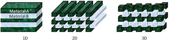 Schematic representation of 1D, 2D, and 3D PCs. The classification of dimensionality is determined by the spatial arrangement of the two materials having different refractive index.