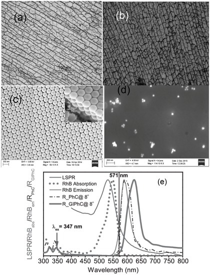 Optical microscope images of: (a) PCs; and (b) GIPC, grown from polystyrene colloids with average diameter of 277 nm. The scale bar is 100 μm; (c) The FESEM image of PCs with the same colloidal diameter showing hexagonal periodic arrangement on the top surface. The scale bar is 300 nm. The inset shows the ordering in the different layers of the crystal, and the smaller particles inside the cracks are the gold nanoparticles infiltrated into the structure; (d) The FESEM image of AuNPs dispersed over a silicon substrate yields an average value of 40 nm for their diameter; (e) The normalized spectra of all features present in the sample, where the solid vertical line at 347 nm denotes the excitation wavelength and the vertical line at 571 nm marks the wavelength of maximum spectral overlap between the emission spectrum and the LSPR band of gold nanoparticles. Spectral bands (from left to right): first band is LSPR due to AuNPs, RhB in dot line is due to Rhodamine B absorption, then RhB line is due to RhB emission, R_PhC@8 in dot line is due to RhB in polystyrene PCs, and finally R_GIPhC@8 in thick solid gray line is due to RhB in polystyrene PCs infiltrated with AuNPs (adapted from [60]).