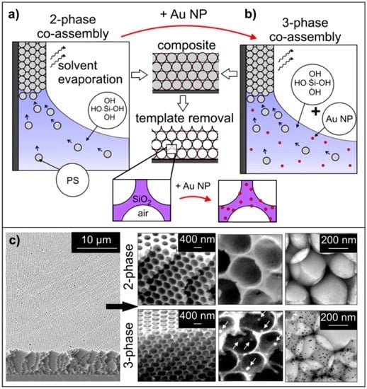 Vasquez et al. developed a three-phase co-assembly method to produce inverse opal films with incorporated gold (Au) nanoparticles [17]. This three-phase co-assembly platform provides a versatile, one-pot approach to create highly ordered functional inverse opal films with embedded, uniformly distributed, accessible gold nanoparticles, as reported in Figure 3.