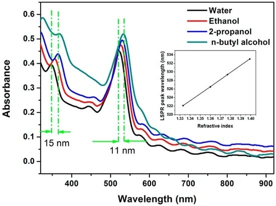 Absorption spectra of i-Au-SiO2-o films with 277 nm pores infiltrated with media of varying RIs as follows: (a) water (n = 1.333); (b) ethanol (n = 1.360); (c) 2-propanol (n = 1.377); and (d) N-butyl alcohol (n = 1.399). The inset is the plot of the LSPR peak wavelength as a function of the refractive index of the surrounding medium [34].
