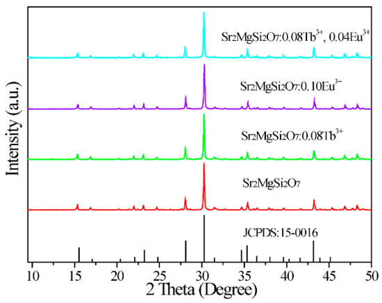 Figure 1 gives the XRD patterns of Tb3+ and Eu3+ ions single-doped or co-doped SMSO phosphors prepared by high temperature solid state reaction at 1300 °C for 3 h. It can be found that all diffraction peaks of phosphors matched well with SMSO phase (JCPDS#15-0016), demonstrating that prepared samples are single-component and a small quantity of Tb3+ and Eu3+ ions will not induce any other significant changes for SMSO lattice.
