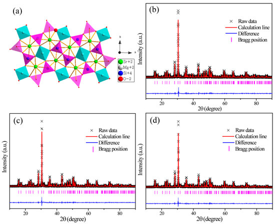 (a) Crystal structure of SMSO. Experimental (black crosses) and calculated (red solid line) XRD patterns and their difference (blue solid line) for (b) SMSO:0.08Tb3+; (c) SMSO:0.10Eu3+ and (d) SMSO:0,08Tb3+, 0.04 Eu3+ samples by the GSAS program. The short magenta vertical lines show the position of Bragg reflections of the calculated patterns.