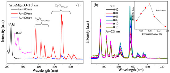 (a) The excitation and emission spectra of SMSO:0.08Tb3+ sample; (b) The emission spectra of SMSO:xTb3+ (x = 0.02, 0.04, 0.06, 0.08, 0.10 and 0.15) samples.