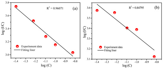 Dependence of lg(I/C) on lg(C) for SMSO:xTb3+ phosphors. ((a) represents concentration of blue emission; (b) represents concentration of green emission; C represents the concentration of Tb3+).