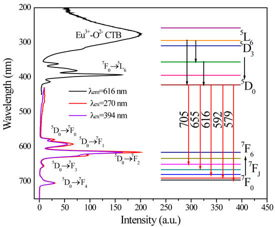 Figure 5 exhibits the excitation and emission spectra of SMSO:0.10Eu3+ sample and simple energy level transitions of Eu3+, respectively. Broad excitation band from 200 to 450 nm was observed monitored at 616 nm. The strongest peak at about 270 nm is ascribed to Eu3+−O2− charge transfer transition (CTB) from negative oxygen 2p orbit to the empty 4f orbit of Eu3+, which is easy to influence by host environment [27]. Other narrow absorption peaks in the regionof 300 to 450 nm at 363, 382, 394, and 467 nm are attributed to 7F0→5D4, 7F0→5G4, 7F0→5L6, and 7F0→5D2 transitions, respectively. Under excited at 270 nm, SMAO:0.10Eu3+ phosphor represents a series of narrow emission lines ranging from 500 to 750 nm at about 579, 592, 616, 654, and 705 nm, which corresponding to 5D0→7FJ (J = 0, 1, 2, 3, and 4) transitions. And we can find that the position of emission peak don’t occur obvious migration under different excitation wavelength.
