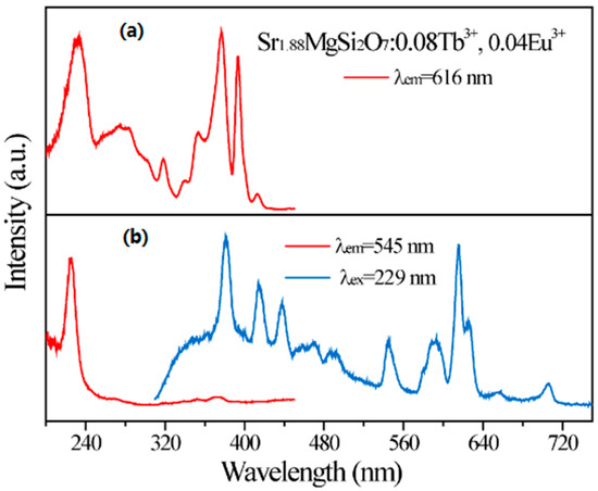 (a) The excitation spectrum of SMSO:Tb3+, Eu3+ phosphor monitored at 616 nm; (b) The excitation spectrum (red line) of SMSO:Tb3+, Eu3+ phosphor monitored at 545 nm and emission spectrum (blue line) of SMSO:Tb3+, Eu3+ phosphor excited at 229 nm.