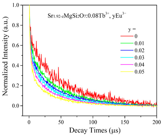 To further confirm energy transfer behavior from Tb3+ to Eu3+, luminescence lifetimes of Tb3+ 5D4→7F5 transition at 545 nm were measured in SMSO:0.08Tb3+, yEu3+ samples under the excitation of 229 nm UV light. As demonstrated in Figure 8, the fluorescent decay curves are described distinctly with increasing Eu3+ doping concentration. Therefore, the luminescence lifetimes of Tb3+ revealed double-exponential types in all samples. The luminescence curves can be matched well with double-exponential expression: