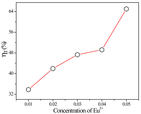 Energy transfer efficiencies (ηT) from Tb3+ to Eu3+ in SMSO:0.08Tb3+, yEu3+ phosphors as a function of different Eu3+ concentration.