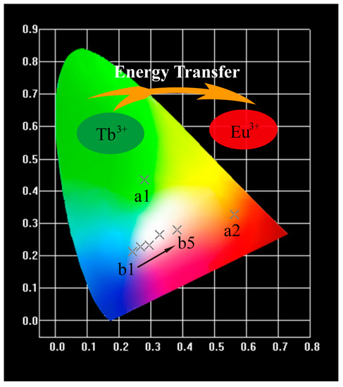 CIE chromaticity coordinates for SMSO:0.08Tb3+ (a1), SMSO:0.10Eu3+ (a2) and SMSO:0.08Tb3+, yEu3+ (b1–b5) phosphors.