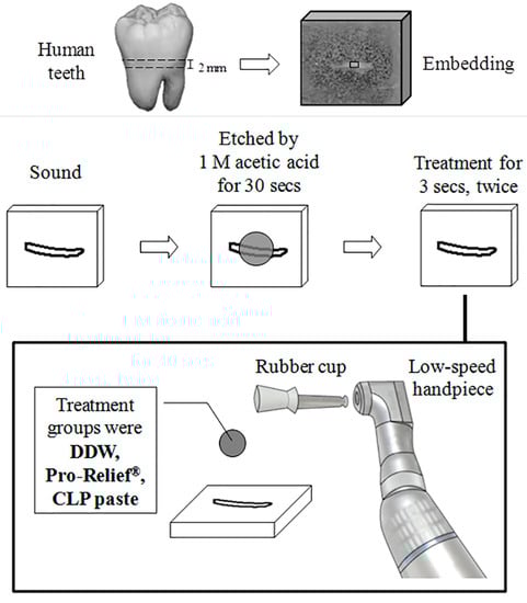 Extracted human teeth were collected after informed consent obtained under a protocol approved by the Ethics Committee of the School and Hospital of Stomatology (TMU-JIRB 201104014), Taipei Medical University. The teeth were cleaned thoroughly and stored in normal saline solution (Otsuka, Taiwan) at 4 °C before use. To standardize this evaluation, all the samples were prepared using experimental procedure shown in Figure 1. Dentin discs with a thickness of 2.0 mm approximately, were cut perpendicular to the long axis of the tooth above the cemento-enamel junction (CEJ) by means of a low-speed 0.15 mm diamond saw (Three A Co., Ltd., Taoyuan City, Taiwan). The dentin disc was embedded by acrylic resin (Orthodontic Resin, Hygenic, Milford, DE, USA). After embedding of the specimens, the facial side of each dentin disc was sanded with 600-grit water sandpaper to create a smear layer (1 × 1 mm2). The specimens were then polished with 1200-grit water sandpaper. The smear layer was subsequently removed by soaking in 1 M acetic acid solution for 30 s.