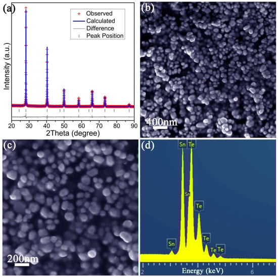 The injection of a NaHTe solution into aqueous Na2SnO2 leads to the immediate formation of a precipitate of SnTe (Scheme 1a,b). Boiling the suspension for 2 h generates ˃10 g crystalline, phase-pure SnTe nanoparticles (Scheme 1c,d). The PXD pattern (Figure 1a) shows that all of the reflections can be exclusively indexed to cubic SnTe (ICDD card No. 65-0319) [60]. Rietveld refinement against the PXD data (Figure 1a; Table 1 and Table 2) confirms that the SnTe product crystallises in the cubic space group , with a = 6.3234(1) Å. SEM images (Figure 1b,c) reveal that the product exists as approximately isotropic nanoparticles, with individual diameters of 60–160 nm and an average diameter of ~95 nm. EDS spectra (Figure 1d) taken across the samples as point and area scans, consistently generate Sn:Te atomic ratios of 51.5(5):48.5(5).