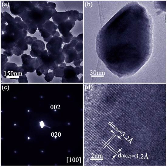 TEM characterisation of SnTe nanoparticles synthesised after 2 h: (a,b) TEM images of a group of nanoparticles and a single particle respectively; (c) SAED pattern collected from the particle in (b); (d) corresponding HRTEM image taken from the same particle.