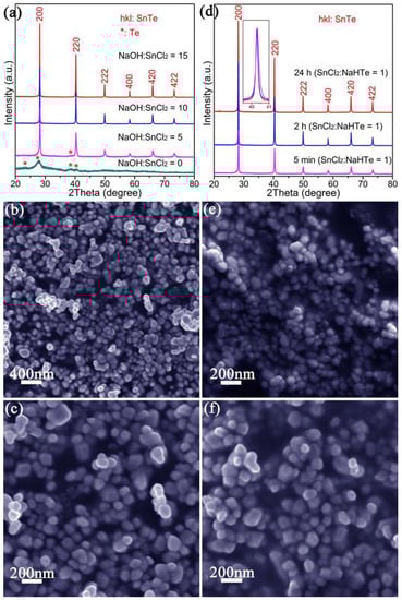 A controlled synthesis of phase-pure SnTe depends on certain, well-defined experimental parameters. For example, the NaOH concentration is a critical synthesis parameter for the synthesis of pure, crystalline SnTe nanoparticles. Without the addition of NaOH, the obtained product is poorly crystalline and contains a large fraction of Te impurity (Figure 3a). By contrast, when increasing the NaOH:SnCl2 molar ratio to 5:1, the phase fraction of Te significantly decreases, accompanied by a sharp increase in the amount of SnTe (Figure 3a). At higher ratios (10:1, 15:1), phase-pure, highly crystalline SnTe can be obtained (Figure 3a). Clearly, increasing the NaOH concentration leads to SnTe with a higher purity. NaHTe can be easily oxidised into Te. Therefore, it is reasonable to deduce that NaOH can promote the disproportionation of Te into Te2− and TeO32−, to eliminate this Te impurity and to drive the formation of SnTe to completion [47,52], probably via: