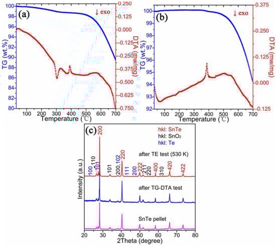 (a,b) TG-DTA profiles of the SnTe powder and pellet, respectively; (c) PXD patterns of an SnTe pellet before and after TG-DTA (to 973 K) and thermoelectric property testing (to 530 K).