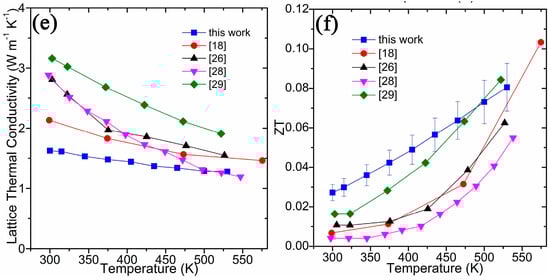The electrical conductivity (σ) of the pellet decreases from ~2.53 × 105 S·m−1 at 300 K, to ~1.39 × 105 S·m−1 at 530 K (Figure 6a), demonstrating the behaviour typical of a degenerate semiconductor, that could be related to a low but significant concentration of intrinsic Sn vacancies in the SnTe structure [16,17]. S increases from ~34.5 μV·K−1 at 300 K, to ~55.8 μV·K−1 at 530 K (Figure 6b). It should be noted that σ and S are relatively low and high, respectively, compared to those of SnTe bulk materials synthesised by high energy ball milling [18] and high-temperature methods [26,28,29], which could result from the influence of impurities (i.e., SnO2 and Te) and/or the relatively low Sn vacancy concentration (no deviation in the Sn site occupancy from unity could be identified by Rietveld refinement, for example, which would support this premise). The power factor (S2σ) of SnTe increases from ~0.30 mW·m−1·K−2 at 300 K, to ~0.43 mW·m−1·K−2 at 530 K (Figure 6c). These figures are comparable to those for SnTe synthesised by high energy ball milling [18] and via high-temperature methods [26,28,29] (Figure 6c). The SnTe pellets display relatively low thermal conductivity (κ), and the values decrease from ~3.33 W·m−1·K−1 at 300 K, to ~2.84 W·m−1·K−1 at 530 K (Figure 6d). The corresponding lattice thermal conductivity (κL) decreases from ~1.63 W·m−1·K−1 at 300 K, to ~1.28 W·m−1·K−1 at 530 K (Figure 6e), which is lower when compared to bulk materials [18,26,28,29], and could be due to the nanostructuring of the SnTe pellets. ZT was derived from the electrical and thermal property results and increases from ~0.027 at 300 K, to ~0.081 at 530 K (Figure 6f). These ZT values are comparable to those obtained previously from SnTe bulk materials prepared via high temperature synthesis (e.g. heating, melting, and annealing precursors at ~973–1423 K for long durations) [26,28,29], or by high energy ball milling [18]. This demonstrates that our surfactant-free solution approach is an energy-efficient and large-scale method for synthesising SnTe, with a comparably high thermoelectric performance. Previous research has demonstrated that the power factor in SnTe can be significantly enhanced through band structure engineering, such as introducing resonant impurity levels through In doping [18] and band convergence through Cd [19], Mg [20], Hg [21], Mn [22] or Ag alloying [23]. Therefore, by introducing these dopants into SnTe nanoparticles as part of our solution synthesis process, improved values for S2σ and ZT can be expected. Judicious doping and substitution is also likely to provide a means to stabilise the cubic SnTe phase to decomposition at elevated temperature. These are aspects that we are currently investigating.