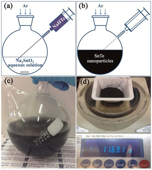 In a typical synthesis of SnTe nanoparticles, 100 mmol NaOH (Sigma-Aldrich Ltd., Dorset, UK, 99.99%) and 10 mmol SnCl2·2H2O (Sigma-Aldrich Ltd., Dorset, UK, 99.99%) were added to 50 mL deionised water (DIW) within a two-neck round-bottom flask, to yield a transparent Na2SnO2 solution. In parallel, 10 mmol Te (Sigma-Aldrich Ltd., Dorset, UK, 99.8%) and 20 mmol NaBH4 (AlfaAesar, Haverhill, MA, USA, 98%) were added to 50 mL DIW within a single-neck round-bottom flask, to prepare a purple 0.2 mol·L−1 NaHTe solution: