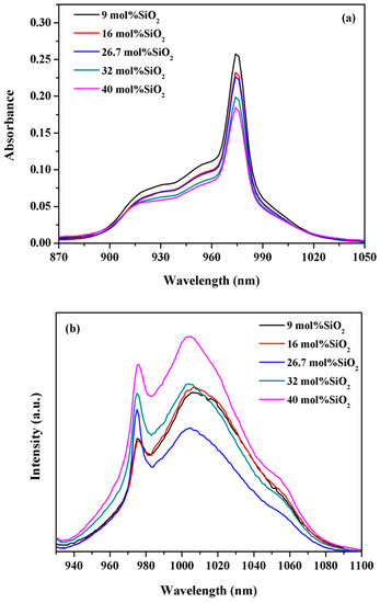 Absorption (a) and emission (b) spectra of 20BaO-(80-x)P2O5-xSiO2-1Yb2O3 (x = 9, 16, 26.7, 32, and 40 mol %, respectively) glasses.