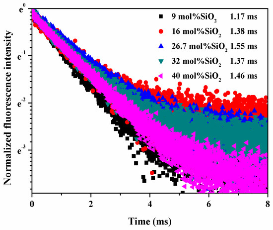 The fluorescence decay curve of Yb3+-doped 20BaO-(80-x)P2O5-xSiO2-1Yb2O3 (x = 9, 16, 26.7, 32, and 40 mol %, respectively) glasses.
