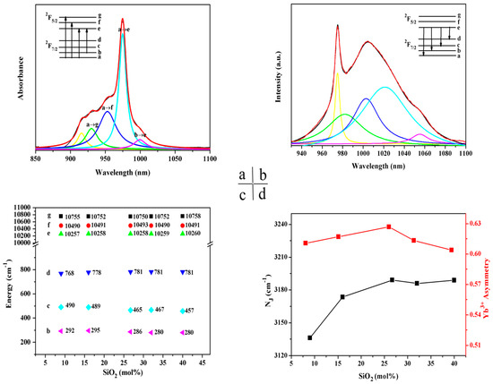 Recently, many research studies have been published on NIR luminescence in Yb3+-doped glasses; however, the origin of this phenomenon has not been identified. The relation between the glass structure and the spectroscopic properties of Yb3+-doped glass is revealed through the evaluation of the scalar crystal-field NJ and Yb3+ asymmetry degree. According to References [18,19,20], the scalar crystal-field NJ and Yb3+ asymmetry degree can be calculated from the Stark splitting levels, which can be derived from Lorentz fitting based on the absorption and emission spectra. As shown in Figure 3, the maximum Stark splitting manifold of the 2F7/2 level (781 cm−1) and the scalar crystal-field NJ and Yb3+ asymmetry degree are observed when the SiO2 concentration is 26.7 mol %.