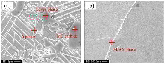 EDS analysis of precipitates. (a,b) Morphology of precipitates; (c) Laves phase; (d) MC carbides; (e) δ phase; and (f) M23C6 carbides.