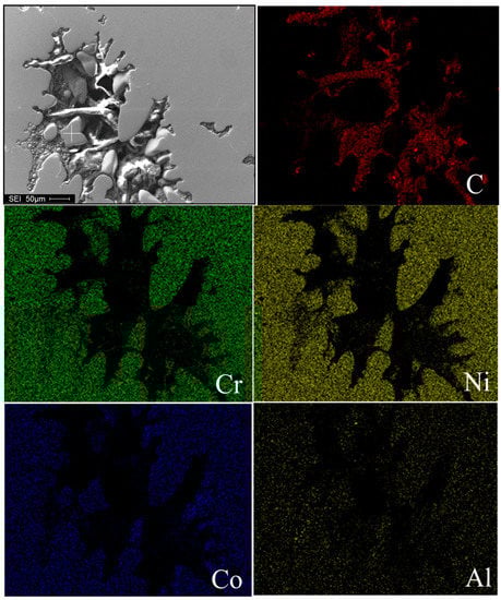In the turbulence of the casting pouring process, Campbell pointed out that the oxide bifilms could be created, and some bifilms may decohere on one side to create microporosity [23]. To further identify the formation mechanism of microporosity in the superalloy casting, the main elements mapping of the superalloy and the inclusion of oxygen were performed as shown in Figure 10. It can be seen that a mass of oxygen emerge around the microporosity, which affirmed that the microporosity formation in the superalloy casting are the result of oxide bifilms and solidification shrinkage together.