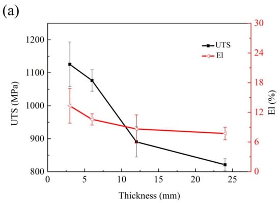 The tensile properties of Ni-Cr-Fe superalloy depend on many parameters, such as alloying elements, Laves phase, carbides, and microporosity. The results of the tensile properties at room temperature, obtained from different sections are shown in Figure 11a. It turned out that the solidification behavior influences the tensile properties significantly. With the decrease of the cooling rate, the ultimate tensile strength (UTS) and elongation (El) decrease. In more detail, the UTS decreased from 1125.5 MPa to 820.9 MPa, and the El decreased from 13.3% to 7.7%, respectively.