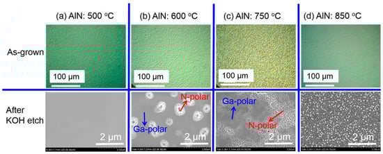 First, we studied the influence of growth temperature of an AlN buffer on the properties of GaN epilayers and found that the growth temperature of the AlN buffer played a critical role in achieving purely N-polar GaN with a smooth surface and high crystalline quality. Figure 1 shows the surface morphologies of 500 nm GaN epilayers grown on c-plane sapphire substrates with an AlN buffer growth temperatures of (a) 500 °C; (b) 600 °C; (c) 750 °C; and (d) 850 °C, respectively. The top array of Figure 1 shows the optical microscopy images of the as-grown GaN epilayers and the bottom array of Figure 1 shows the SEM images of GaN after KOH etching. It is known that the Ga-polar terminated GaN is very inert to KOH etching, whereas N-polar terminated GaN would be etched by KOH solution and the surface of N-polar GaN will become very rough. As seen in Figure 1a, the surface of GaN with an AlN buffer grown at 500 °C is featureless after KOH etching, indicating that GaN with an AlN buffer grown at 500 °C is purely Ga-polar. With increase the AlN buffer growth temperature to 600 °C, it shows that the majority of the area is still Ga-polar with the unetched surface after KOH etching (marked by a blue arrow in Figure 1b). However, N-polar GaN starts to form with etching holes appeared after KOH etching, marked by a red arrow in Figure 1b. With increasing growth temperature of the AlN buffer to 750 °C, it shows that dramatically increased area of GaN has already become N-polar showing pyramidal rough surface after KOH etching, as shown by the red arrow in Figure 1c. The unetched region of Ga-polar GaN is labeled by the blue arrow in Figure 1c. It reveals that the GaN epilayer with an AlN buffer grown at 600 to 750 °C is mixed-polar. By increasing the growth temperature of the AlN buffer further to 850 °C, GaN epilayer becomes very rough with uniform pyramids formed on the surface over the entire wafer after KOH etching, as shown in Figure 1d. GaN with an AlN buffer layer grown at above 850 °C also exhibits pyramidal surface morphology over the entire wafer after KOH etching (not shown here). It indicates that the GaN epilayer has become purely N-polar with an AlN buffer grown at a temperature of above 850 °C.