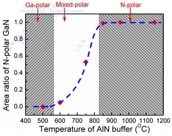 The dependence of the area ratio of N-polar on the growth temperature of the AlN buffer.