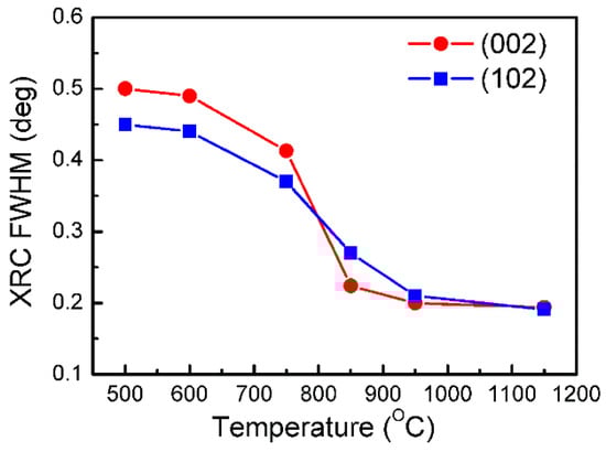 The crystalline quality of the GaN epilayer with an AlN buffer layer grown at different temperatures was characterized by XRD and the full width at half maximums (FWHMs) of XRD rocking curves (RCs) are shown in Figure 3. It is found that the crystalline quality of the GaN epilayer with an AlN buffer grown at temperature of below 600 °C is very poor with (002) and (102) FWHMs of about 0.5° and 0.45°, respectively. By increasing the growth temperature of the AlN buffer from 600 to 850 °C, the crystalline quality of the GaN epilayer is significantly improved. However, by increasing the growth temperature of the AlN buffer above 950 °C, the FWHMs of XRD RCs remain nearly the same since purely N-polar GaN is formed.