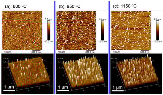 To understand the influence of an AlN buffer on the crystalline quality of GaN epilayers, three AlN buffer layers were grown at different temperatures with growth stopped after thermal annealing and right before the growth of a high-temperature GaN epilayer. The surface morphology of the AlN buffer layer was examined by AFM. Figure 6a–c show the AFM images of the AlN buffer grown at temperatures of 600, 950, and 1150 °C, respectively. The upper and lower array show the two-dimensional and three-dimensional AFM images, respectively. The RMS extracted from AFM images are 1.4, 1.9, and 2.0 nm, respectively. This clearly indicates that the AlN buffer grown at 600 °C exhibits a very low density of large grains (white spots in AFM images) with a size of 30 to 50 nm. By increasing the growth temperature to 900 °C, the density of large size grains increases dramatically. The densities of the large-size grains are 2.3 × 108, 1.7 × 109, and 1.9 × 109 cm−2 for the AlN grown at 600, 950, and 1150 °C, respectively. The high density of the large-size grains in the AlN buffer layer will promote the lateral growth and coalescence of initial GaN islands grown on AlN grains, which leads to an increased volume of defect-free columnar domains, thus improving the crystal quality of the GaN epilayer [,]. That is the reason why we observed much lower XRC FWHMs for the GaN epilayer with an AlN buffer grown at 900 °C compared to that grown at 600 °C in Figure 3. However, by increasing the growth temperature of the AlN buffer further to 1150 °C, the density of the large-size grain does not exhibit any significant change in comparison with the AlN buffer grown at 900 °C. Hence, the XRC FWHMs of the GaN epilayers are nearly the same as those of AlN buffers grown at a temperature of above 900 °C.