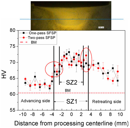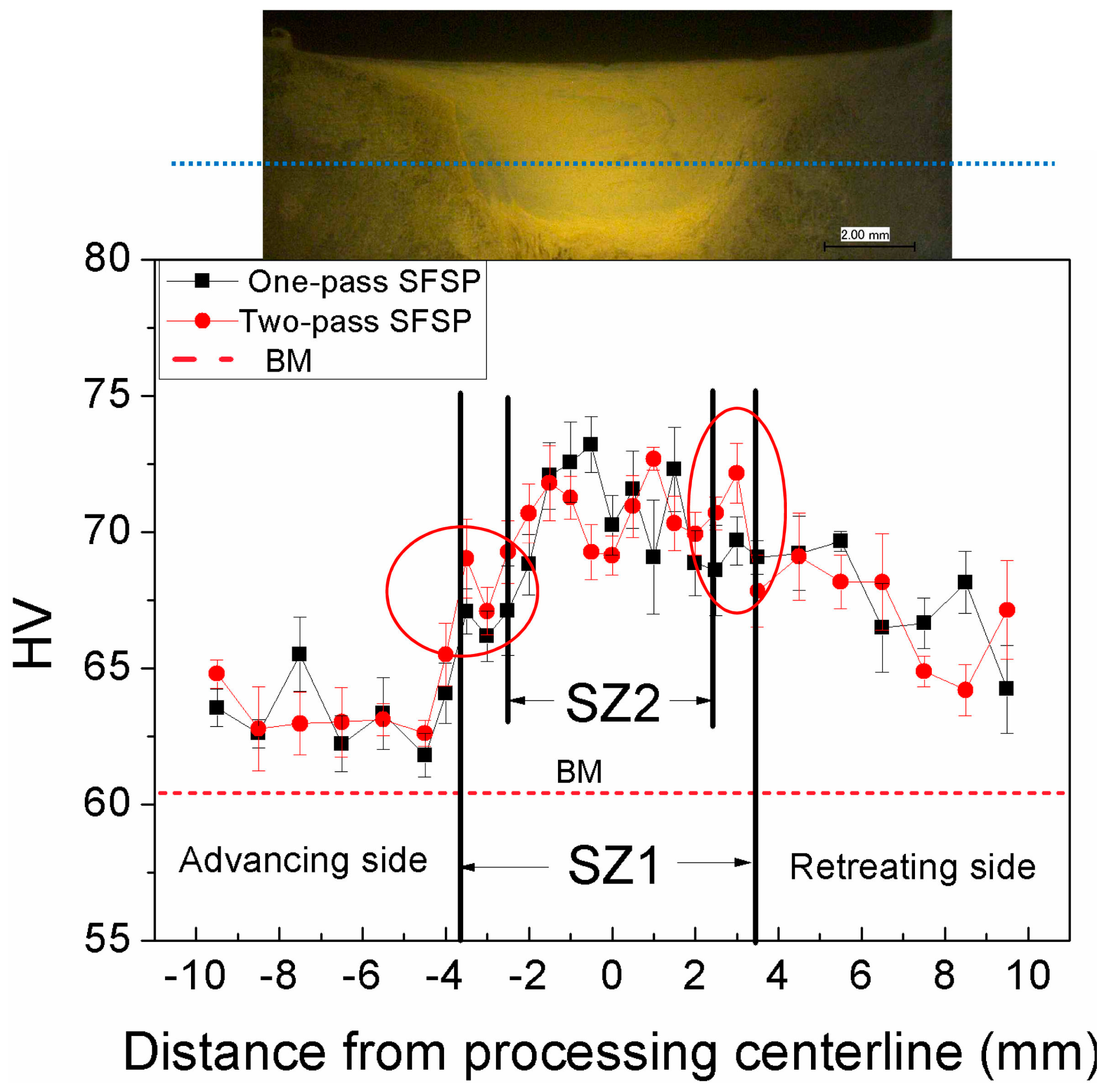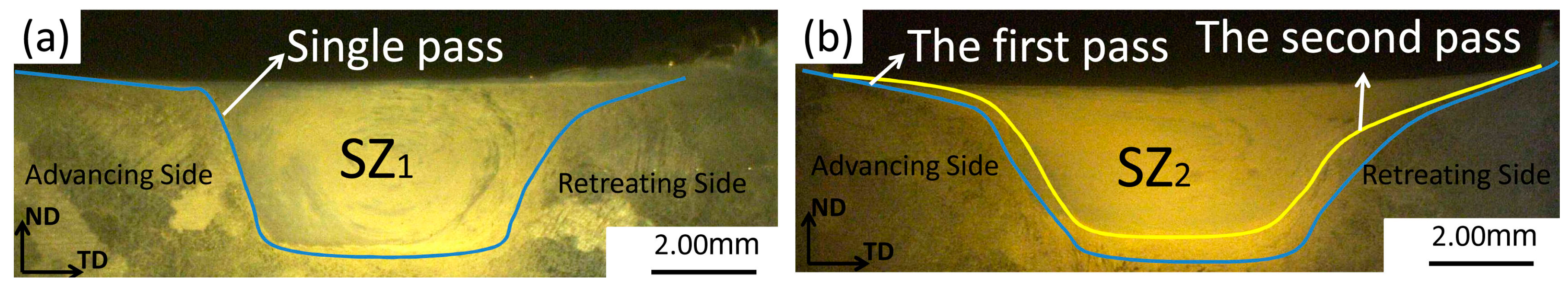 - Texture evolution during one-pass and two-pass SFSP caused the basal plane (0002) to be aligned with the angle ~19° and ~35° between c-axis of grains and PD, respectively. The orientation of basal plane in the SZ of the two-pass SFSP sample is aligned for easy slip, which leads to a higher ductility.