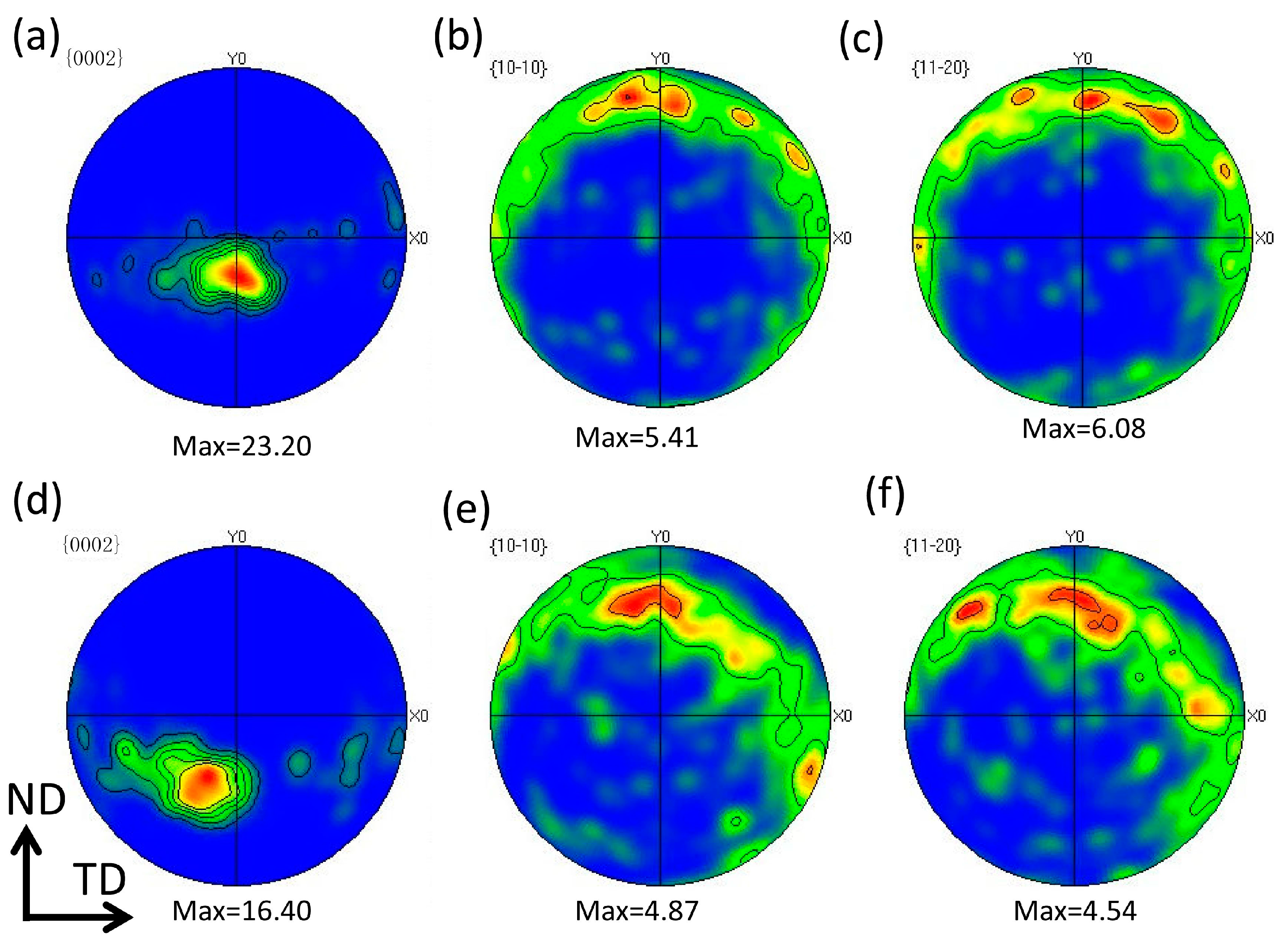 | Angle between c-axis 1 and TD/° | Angle between c-axis and PD/° | (Max Values of the Pole Figures in MRD) | ||||
