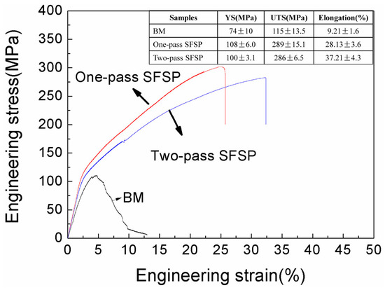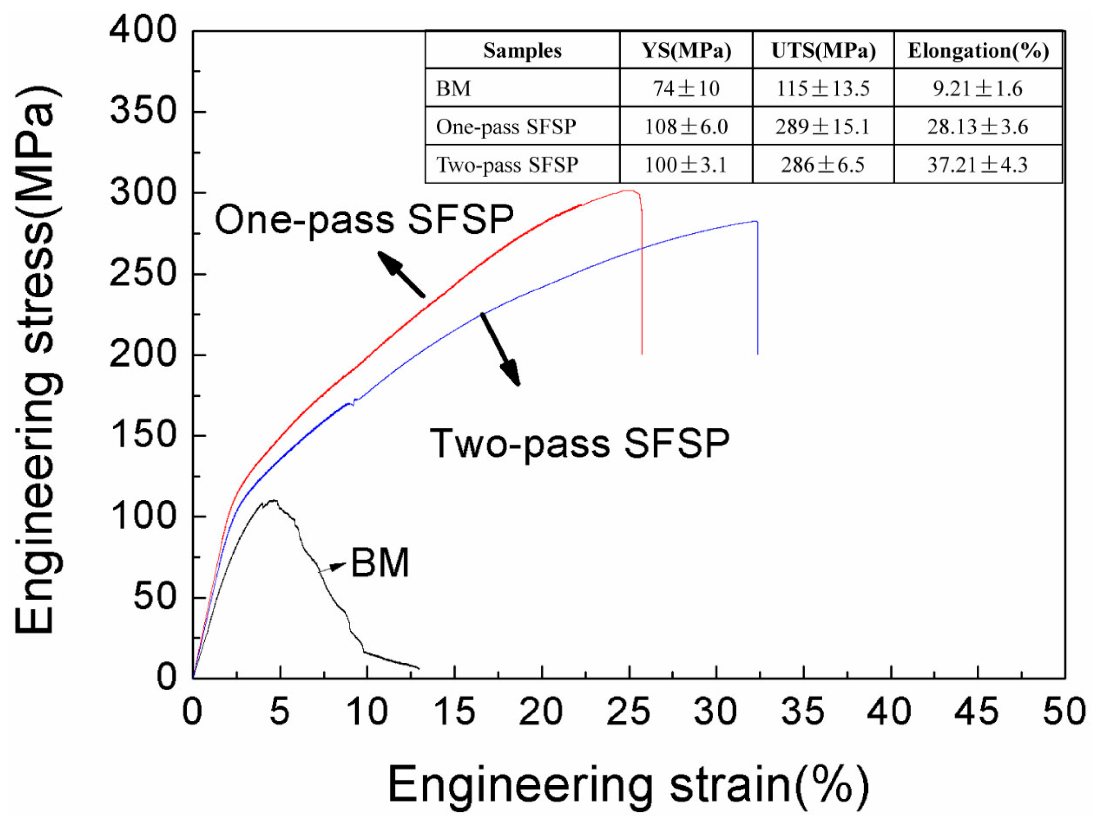 - Compared to as-cast AZ61 alloy, the mechanical properties of SFSP specimens were improved due to the grain refinement and precipitation strengthening. Furthermore, the elongation of two-pass SFSP specimen was remarkably increased to 37.2% ± 4.3% with a bit loss in strength as compared to the one-pass SFSP alloy.