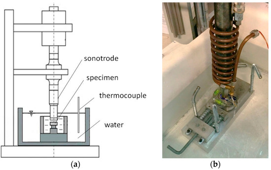 Thus, in agreement with the standard, the specimen was immersed in distilled water and the vibrating tip of the horn was placed in close proximity to it. In this way, the cavitation bubbles induced by the horn acted on the specimen. In the used configuration, the horn tip had a diameter of 18 mm, thus the exposed area resulted about 254 mm2. The specimens were fixed in a holding system at 0.5 mm from the horn tip. As shown in Figure 2, both the holding system and horn were placed in a tank filled with distilled water at constant temperature (room temperature).
