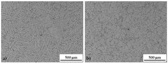In Figure 3a, comparison between the microstructure of as-cast NUST and UST samples is reported. NUST samples show the typical microstructure of casting products, characterized by the dendritic Al-rich phase (light gray in the images) surrounded by the eutectic, where some micro-shrinkage porosity can be detected (Figure 3a). The application of ultrasound to the liquid alloy produced a finer microstructure with an almost globular or rosette type morphology of the primary Al-rich phase (Figure 3b). It was found that, after US treatment, grain size decreases from 501 ± 115 μm for the NUST sample to 210 ± 61 μm for the UST sample, confirming the effectiveness of US treatment in reducing grain size, as already demonstrated for wrought alloys in a previous work by the authors [37]. This effect is due to the multiplication of solidification nuclei by activating heterogeneous insoluble substrates (such as oxides, always present in liquid aluminum) [38,39]. In fact, it is known that nonmetallic inclusions—like oxides usually dispersed—serve as hydrogen concentrators in liquid aluminum alloys. This makes these particles efficient cavitation nuclei and decreases the cavitation threshold [39]. As discussed in literature, in metallic melts, where free gas bubbles are hardly possible, only solid nonmetallic inclusions may qualify as cavitation nuclei because gas can exist in capillaries on the surface of the inclusions. In real melts containing oxides or other insoluble particles, hydrogen precipitates on poorly wetted insoluble inclusions and, generally, the precipitation follows the basic rules of heterogeneous nucleation and growth [39].