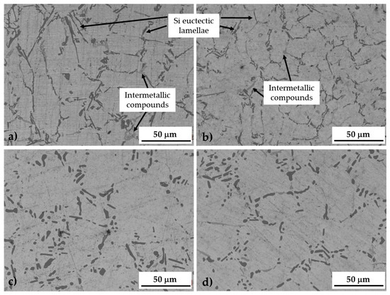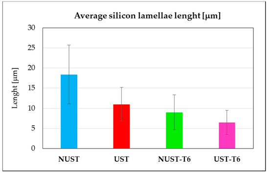 At higher magnification, it can be noted that the US treatment slightly induced a refining effect on the silicon eutectic lamellae as well as on intermetallic compounds (Figure 4a,b) [38,39]. As already stated by Puga et al., in fact, cavitation bubbles induced by UST can behave like atoms of chemical modifiers, promoting the modification of silicon. Additionally, the decrease of temperature at the bubble/melt interface during the expansion phase of a cavitating bubble suggests that the treatment can also influence the nucleation frequency of eutectic cells, promoting the nucleation of a higher number of silicon particles [48]. As a result, UST alloy presented an average length of the Si lamellae equal to 10.6 μm vs 18.4 μm for the NUST one. Additionally, the standard deviation is reduced from 7.3 μm for the NUST to 4.2 μm for the UST. These differences resulted more limited after the solution treatment (4.36 μm for the NUST vs 3 μm for the UST samples), which corresponds to the first phase of the T6 treatment, able to modify the size and morphology of the eutectic silicon. The induced spheroidization and coarsening of the Si particles can be clearly noted in (Figure 4c,d). In Figure 5, the average length of silicon lamellae in the different samples is summarized.