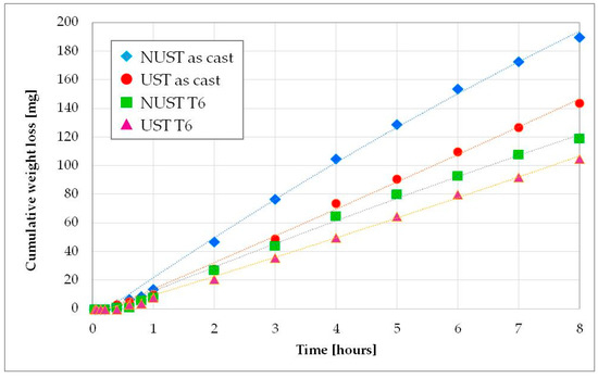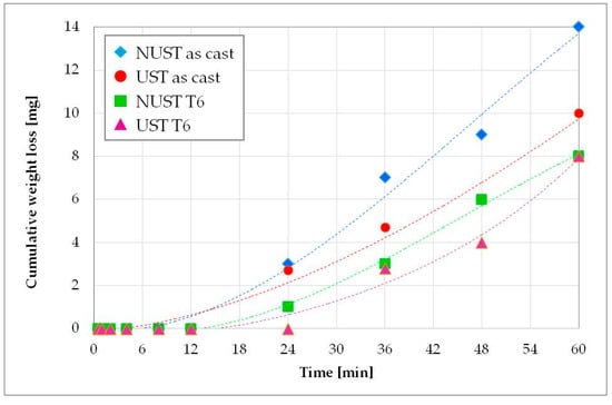 At first, the incubation period was estimated, i.e., the initial stage of the damaging phenomenon. During this stage, the erosion rate is negligible and it represents the accumulation of plastic deformation and internal stresses under the surface, which precedes significant material loss [47]. According to the ASTM G32 standard, the incubation period is quantitatively defined as the intercept, on the time axis, of a straight-line extension of the maximum-slope portion of the cumulative erosion-time curve [47]. Thus, the cumulative mass loss curves vs time for the different alloy conditions during the first hour of exposure were plotted, as shown in Figure 6. By the intercepts to these curves, the incubation time results in the order of 15 min for both the as-cast UST and NUST alloys, slightly higher for the NUST T6 sample (about 19 min) and about double (27 min) for UST T6 one. It follows that a general trend of higher incubation time with increasing hardness can be highlighted. However, a direct proportionality cannot be stated. In fact, analyzing the evolution of the damage (Figure 6), the UST as-cast alloy seems to react more closely to NUST T6 than NUST as-cast, notwithstanding its hardness is substantially lower than that of NUST T6 alloy but comparable to that of the as-cast NUST. This result can be related to the higher chemical homogeneity, the refinement of the grains and primary particles, their uniform distribution in the volume, and the refined or modified structure of the eutectic after the ultrasound treatment [39,48,49].