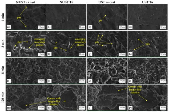 After 3 min (Figure 8e–h), the number of pits increased and undulations and plastic deformation of the surface can be seen, particularly in the as-cast alloys. The more massive deformation is produced by the impact pressure of many thousands of bubbles collapsing together [3] that induce a localized temperature increase (in the order of hundreds of centigrade degrees) [54] and reduce the strength of the metal surface, enhancing the damage. In the case of dendritic microstructures, secondary phases—as Si particles and intermetallic compounds—seem to arise on the damaged surface (Figure 8e,f) because of the deformation and removal of the surrounding Al-rich phase matrix. Therefore, the damage can follow the dendritic network. On the contrary, in the UST microstructure, the primary phase globules are less interconnected and the secondary phases, better distributed along their boundaries, seem to offer a barrier to the propagation of the damage, providing an anchor to the underlying material and resisting detachment [31].