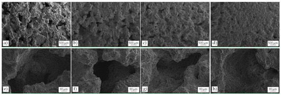 At higher magnification, the eroded surface of the NUST as-cast alloy (Figure 10a–e) showed a larger number of pits and wider cracks (in the order of 700 µm) than the other tested conditions (Figure 10b–d,f–h). In particular, NUST T6 (Figure 10b,f) and UST as-cast (Figure 10c,g) revealed similar damage, with a slightly higher amount of pits in the UST as-cast sample. The same damaging mechanism was shown by the UST T6, whose higher resistance is demonstrated by the lower amount of pits that seem less deep (Figure 10d,h).