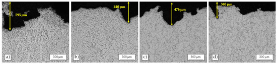 All the alloys show pits or craters. However, they resulted more pronounced on the NUST surface than on the as-cast UST one, confirming the previous observations. In particular, the depth of one of the deepest erosion pits detected on the as-cast NUST sample was 595 µm, while that of the deepest erosion pits observed on the same alloy after ultrasound treatment is in the order of 476 µm (i.e., around 20% smaller). The same trend was observed for the NUST and UST alloy after heat treatment, whose deepest pits were around 440 µm and 340 µm, respectively. The analysis on the cross sections of the eroded areas further confirm the previous finding. In fact, it shows the improvement on cavitation erosion resistance induced by the US treatment, so that the as-cast UST alloy behaves similarly to the NUST T6.
