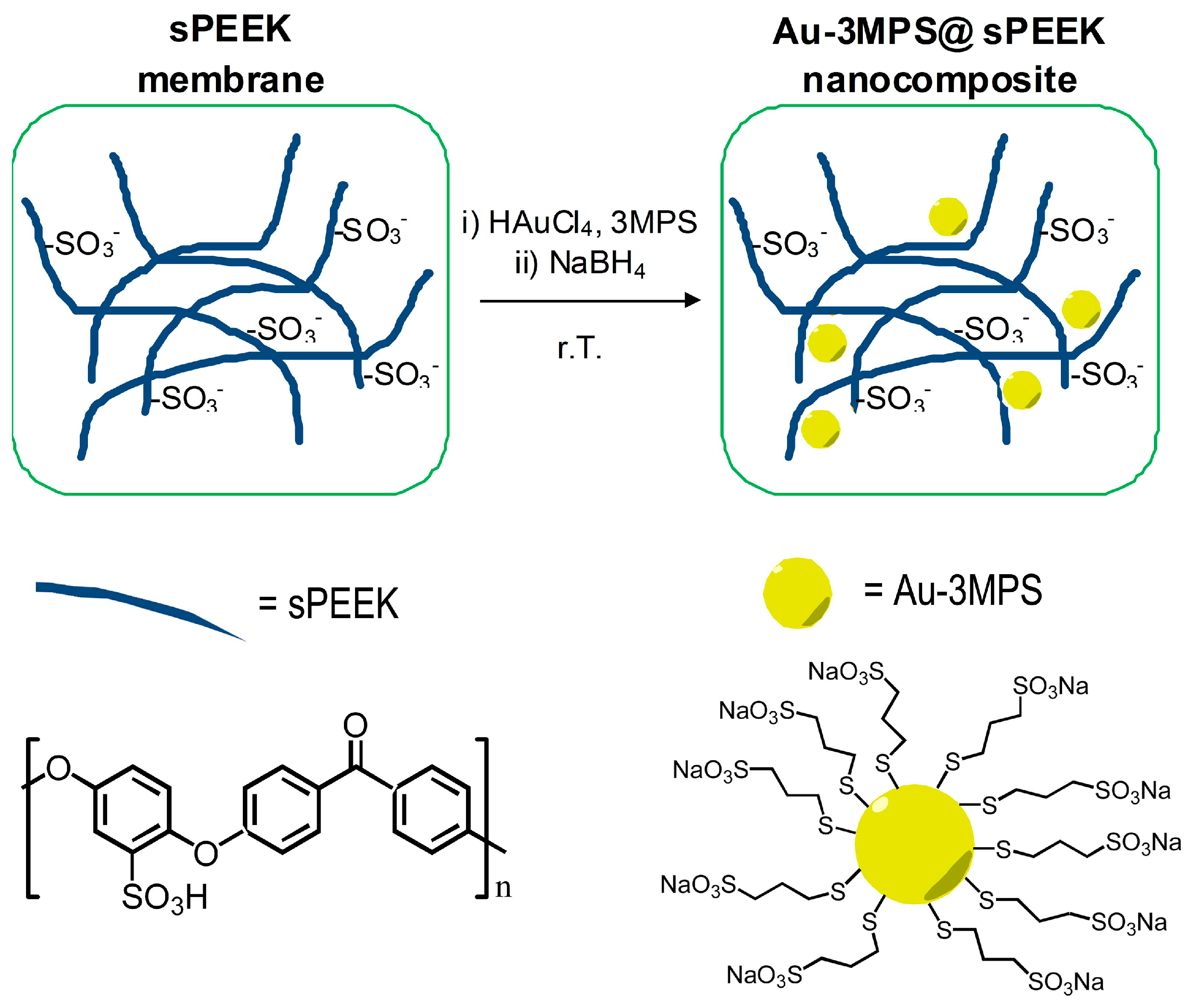 Schematization of the Au-3MPS@sPEEK nanocomposite formation.