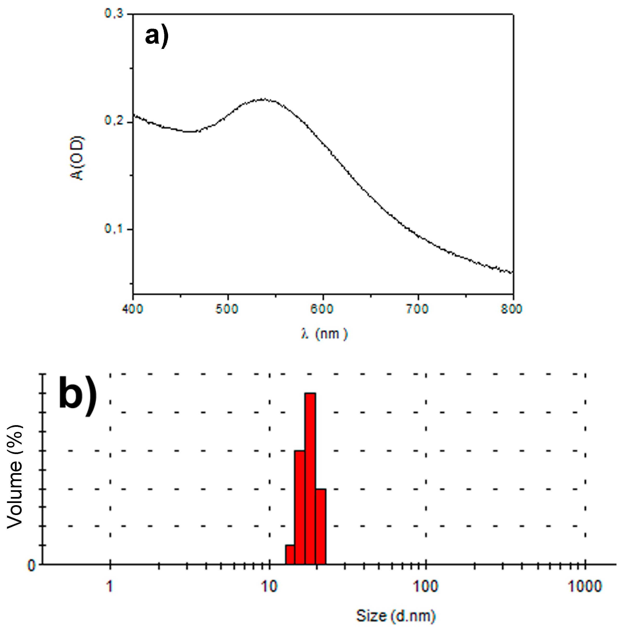 The formation of Au-3MPS nanoparticles recovered from the reaction mixture was confirmed using UV–visible spectral analysis (Figure 2a). The characteristic absorption peak was observed at 540 nm, due to the surface plasmon resonance of AuNPs. The DLS results showed that AuNPs have a narrow size distribution with an average size of about 14 ± 3 nm (Figure 2b).