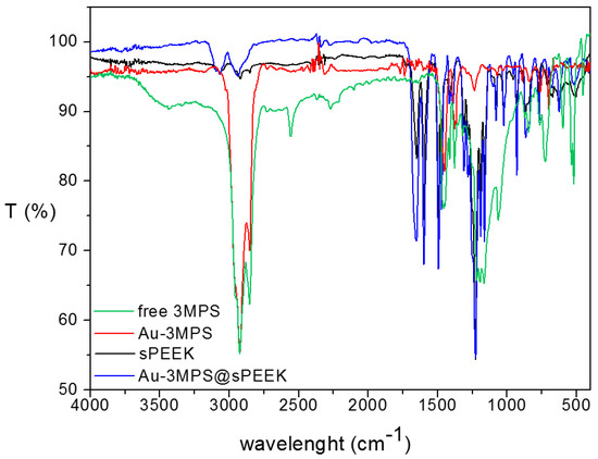 FTIR Transmission spectra of the nanocomposite Au-3MPS@sPEEK (blue line) compared with the sPEEK host membrane (black line), Au-3MPS NPs collected from the impregnation solution (red line), and free 3MPS thiol (green line).