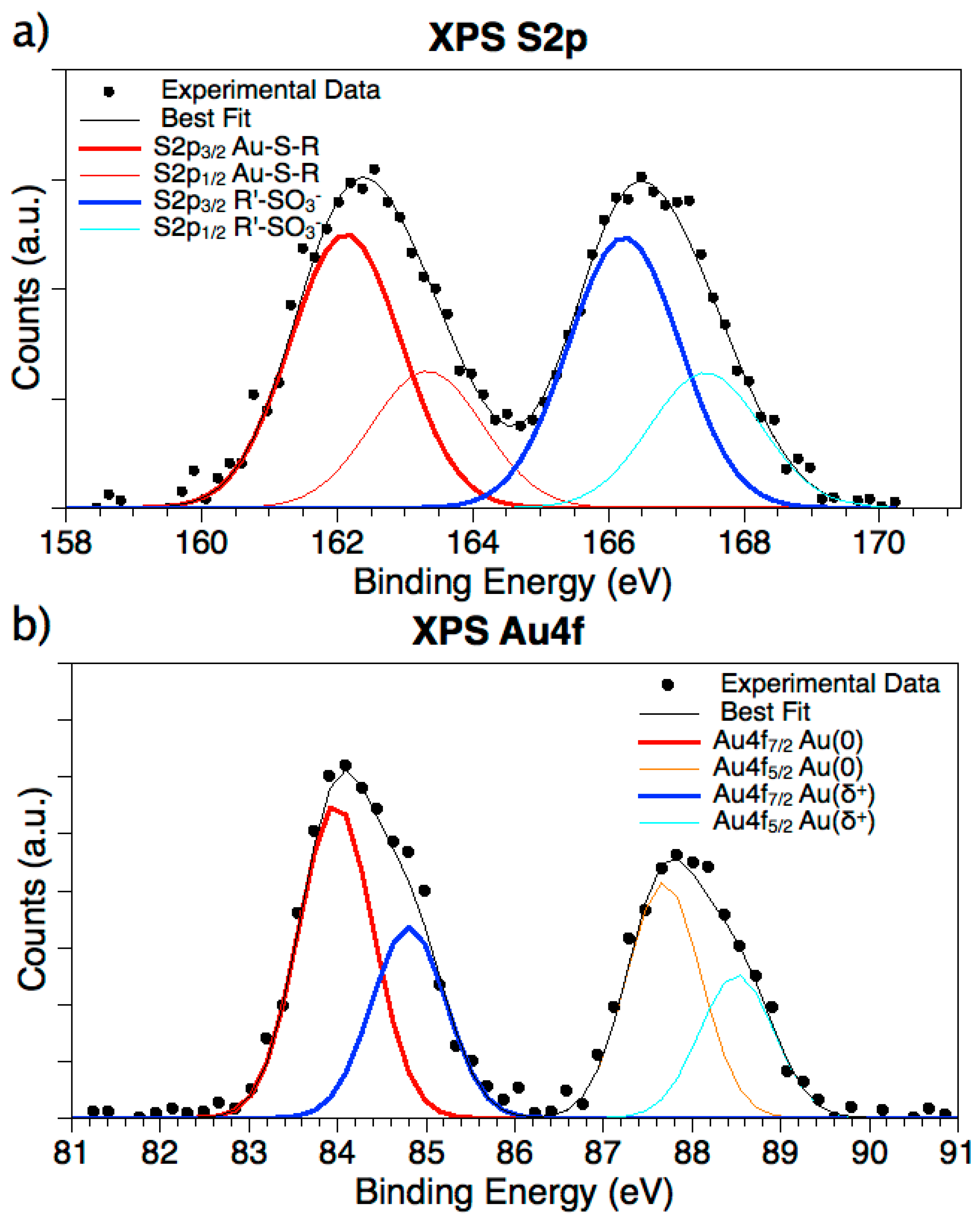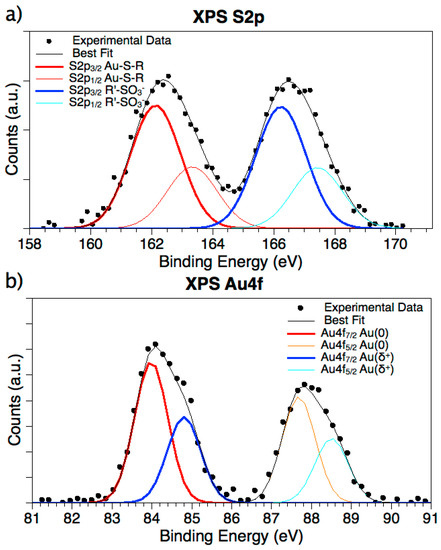S2p3/2,1/2 and Au4f7/2,5/2 doublets were fitted by using the same full width at half-maximum (FWHM) for each pair of components of the same core level, a spin–orbit splitting of, respectively, 1.2 eV and 3,7 eV, and branching ratios of S2p3/2/S2p1/2 = 2/1 and Au4f7/2/Au4f5/2 = 4/3. When several different species were individuated in a spectrum, the same FWHM value was used for all of the individual photoemission bands [77].