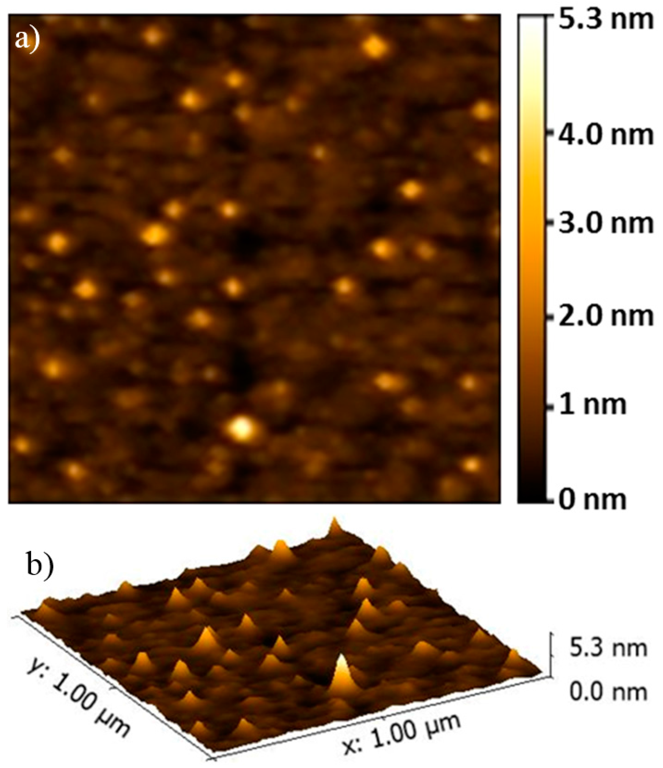Both Au-3MPS nanoparticles and Au-3MPS@sPEEK nanocomposite membranes were subjected to AFM analysis, to observe their morphology and surface roughness. As a first experiment, Au-3MPS nanoparticles deposited on a Si/SiO2 substrate were characterized and a typical image is presented in Figure 5.