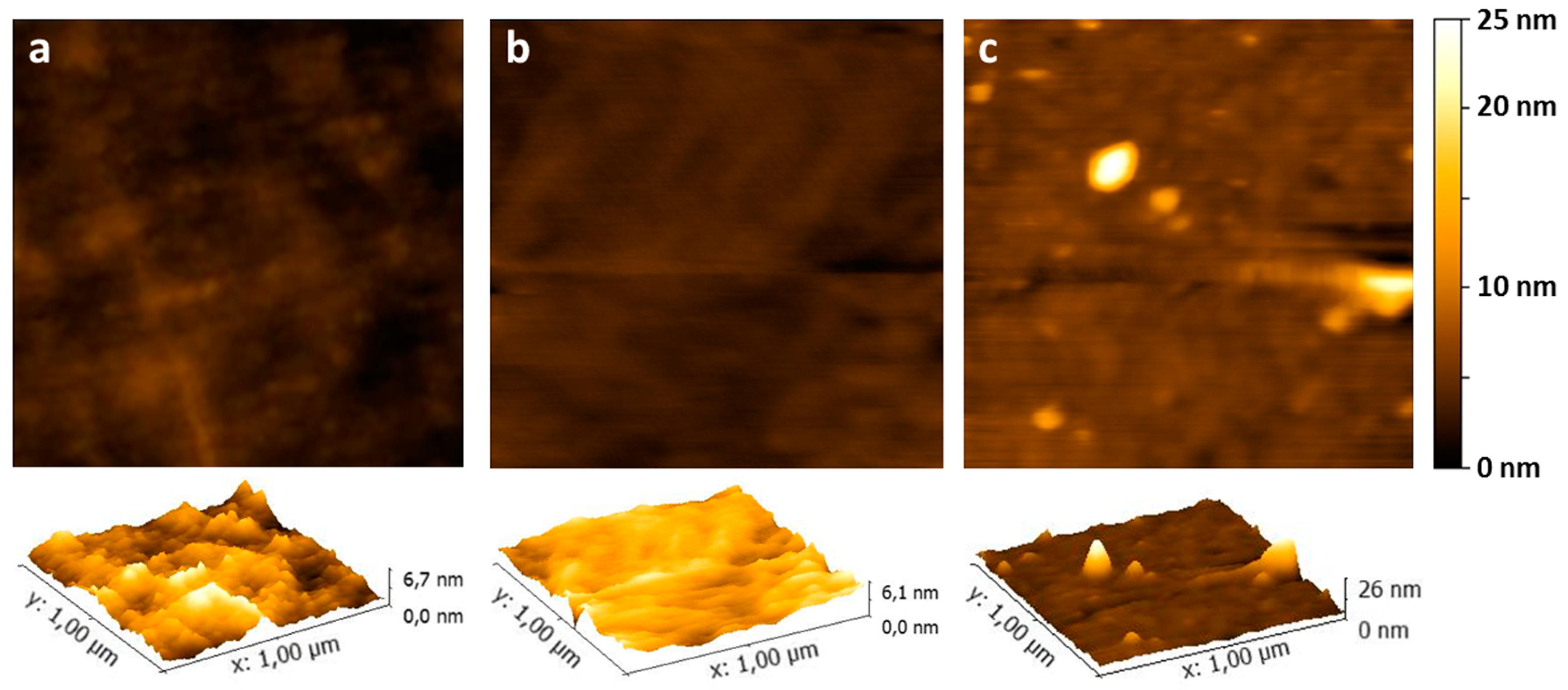 The characterization reported in the literature on sPEEK and sPEEK decorated with nanofillers, has mainly been performed via XPS, XRD, or EDX [59,60,61] to investigate the composition, and by FTIR, SEM, and TEM, to provide detailed information on the membrane surface and the inner section [62,63]. The surface roughness is usually measured using profilometers [64,65], while few groups have performed AFM [66,67,68,69] characterization, despite the well-established use of this technique to characterize multi-layer systems, compare the roughness upon the addition of subsequent charges [70], and check the homogeneous distribution of the nanofillers within the membrane.