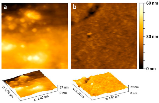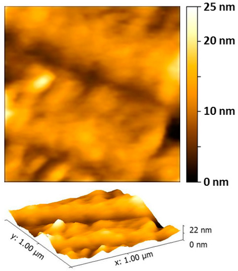 Finally, the effect of pH on the Au-3MPS@sPEEK membrane has been tested, by dipping the samples at pH = 5 and pH = 2. The measurements at different pH levels showed no particular differences. It is certain that the hydration of the membrane is not instantaneous, and that it is reversible. In fact, after keeping the membrane wet for 1 h upon the deposition of one drop, drying, and measuring its roughness, a maximum height of 113 nm was reached, with a roughness of 8.98 nm, evaluated on a 1 μm × 1 μm area. On the other hand, 1 h after drying, it is possible to observe a partial reduction of the roughness, with a value of 1.49 nm (Figure 8).
