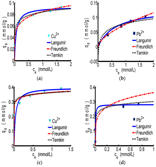 Langmuir, Freundlish, and Temkin equations (Equations (3)–(5), respectively) were used to estimate the isotherm parameters for ChW/PTW on Cu2+ or Pb2+.